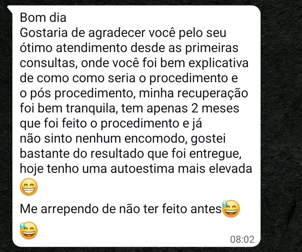 O resultado imediato é parcial. Após o processo completo de cicatrização e com acompanhamento adequado, o resultado final é 100% natural e definitivo.